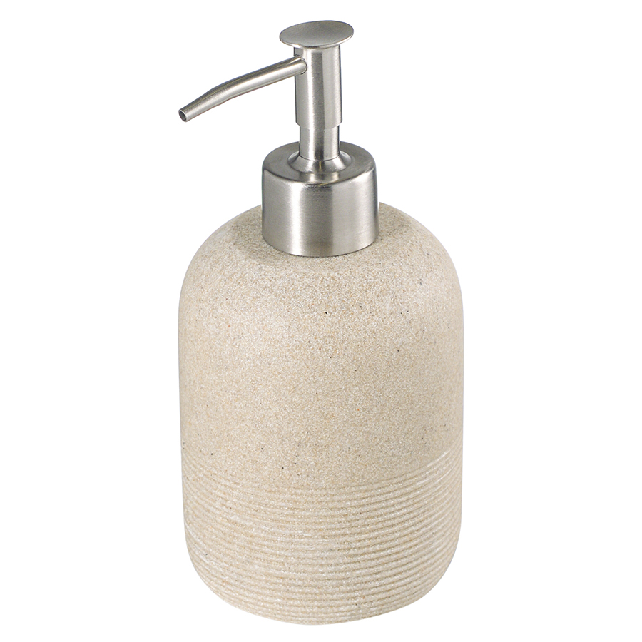 "Диспенсер для жидкого мыла Loup имеет корпус из полирезина, стилизованного под натуральный камень бежевого оттенка. Материал отличается устойчивостью к влаге, ударам и царапинам, что делает его идеальным выбором для ванной комнаты. Наружные элементы дозирующего механизма выполнены из нержавеющей стали, обладающей высокой прочностью, долговечностью и отличными антикоррозионными свойствами. Кроме того, ее блестящая поверхность придает изделию презентабельный вид.