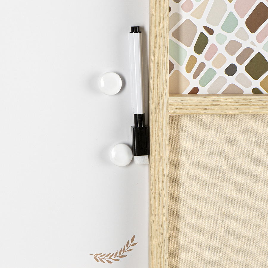"Доска для заметок Memo совмещает в себе три типа покрытий: пробковое, текстильное и поверхность для маркера. Такой стенд позволяет не только записывать информацию, но и крепить напоминания в виде заметок из бумаги и других материалов.