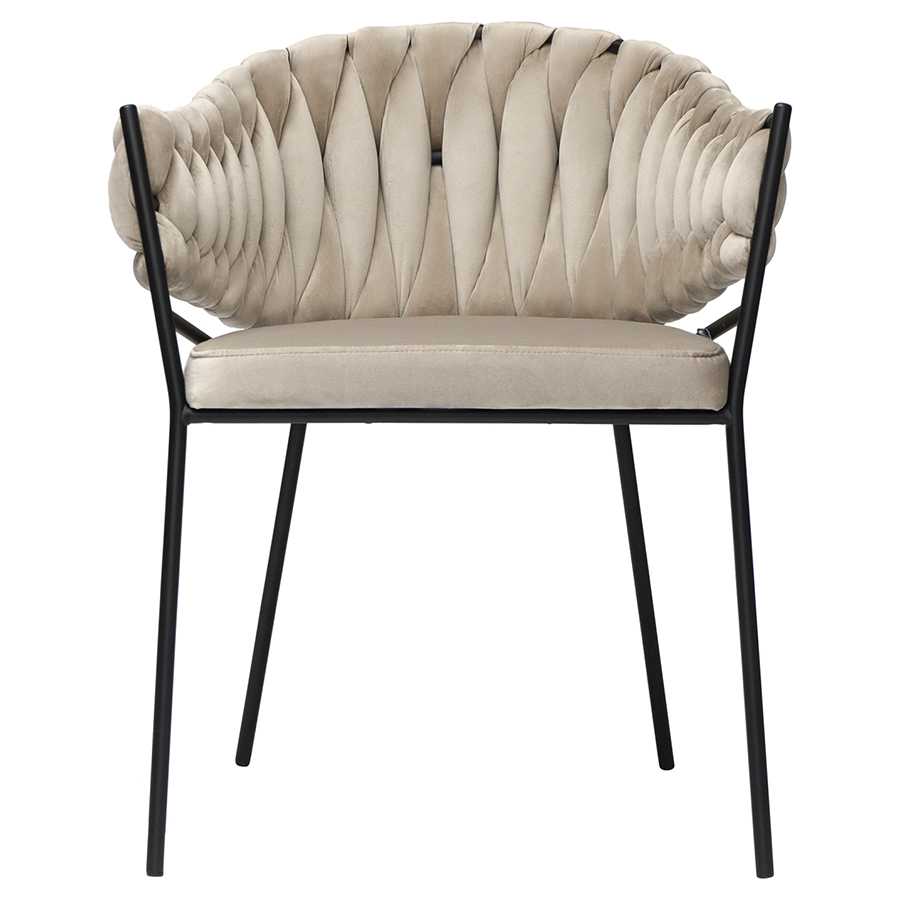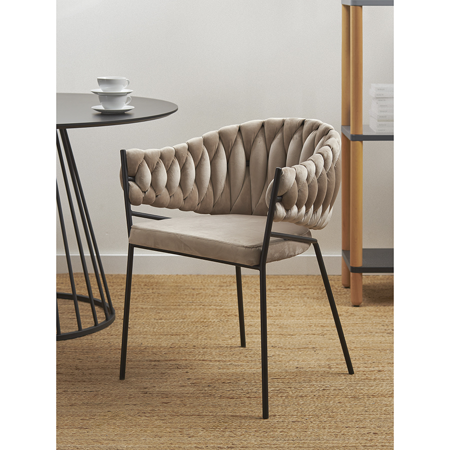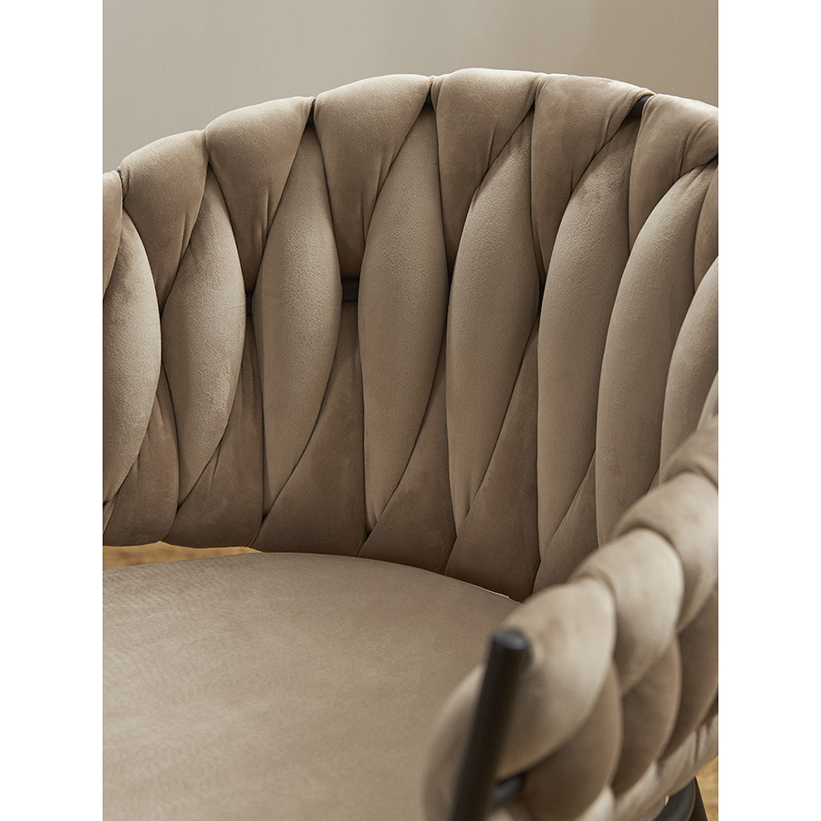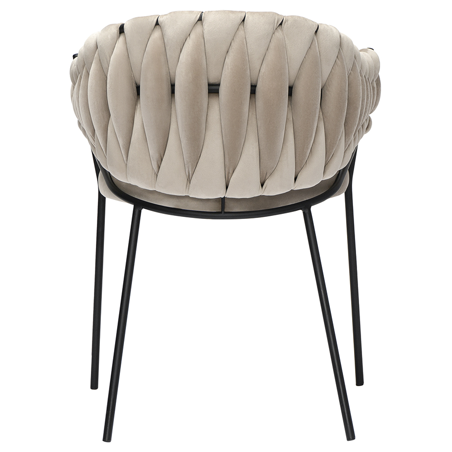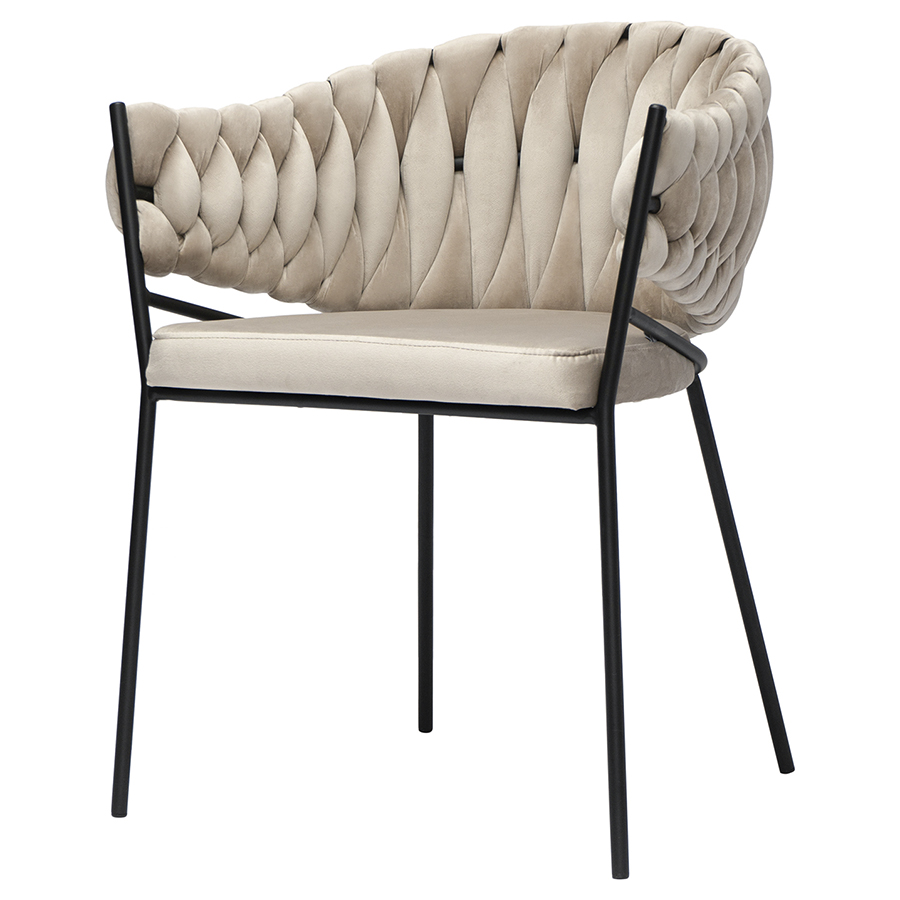 "Кресло Lind поможет сделать акцент на стильном дизайне интерьера. Главная особенность модели – оригинальная плетеная спинка. Бархатистый, приятный на ощупь велюр дарит тактильный комфорт и смягчает строгие формы прочного железного каркаса. За счет высоких ножек модель выглядит утонченно, благодаря чему не перегружает пространство. Сиденье с наполнителем из пенополиуретана, глубокая посадка и наличие подлокотников обеспечивают комфорт во время отдыха. Мебель в спокойных тонах станет оптимальным вариантом для спальни, гостиной, кабинета, оформленных в любой цветовой гамме.