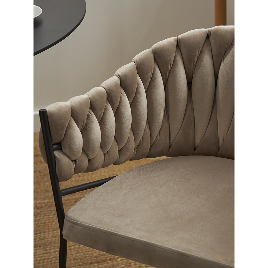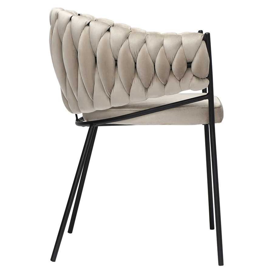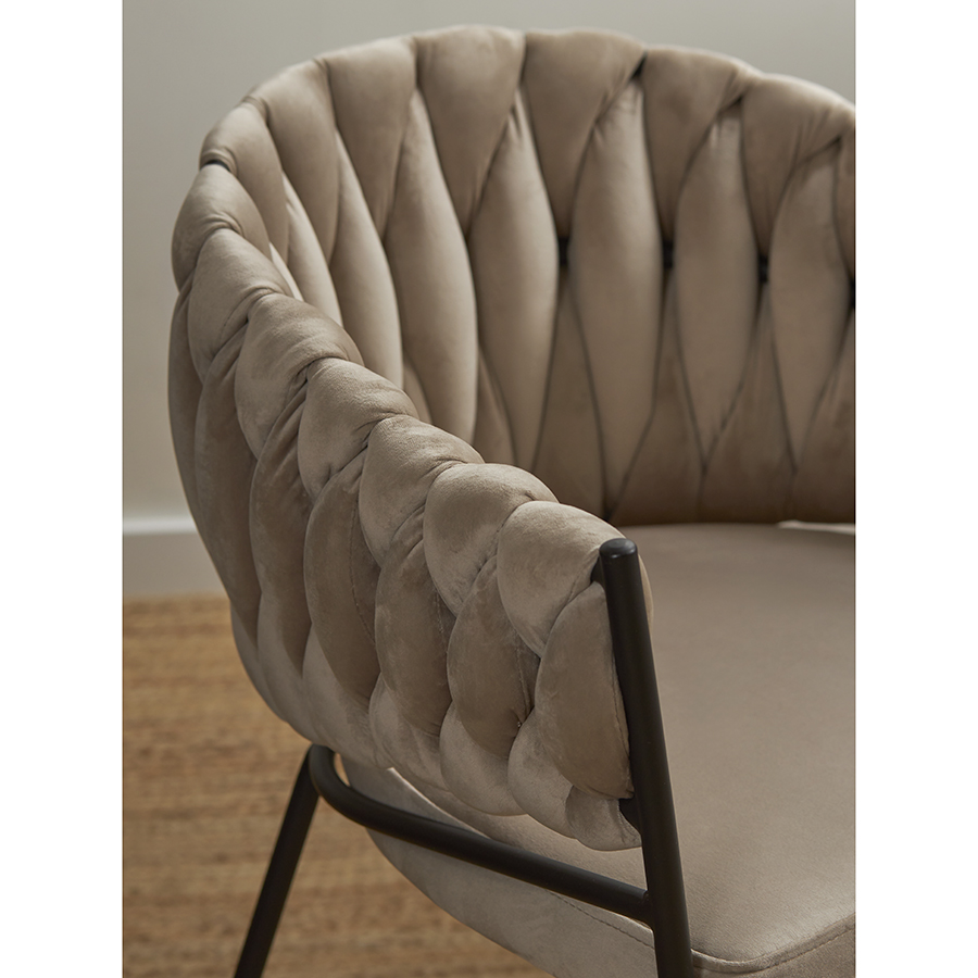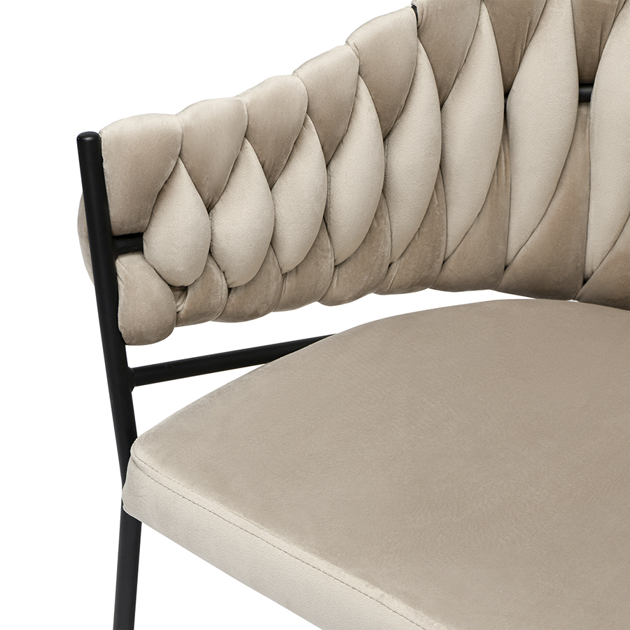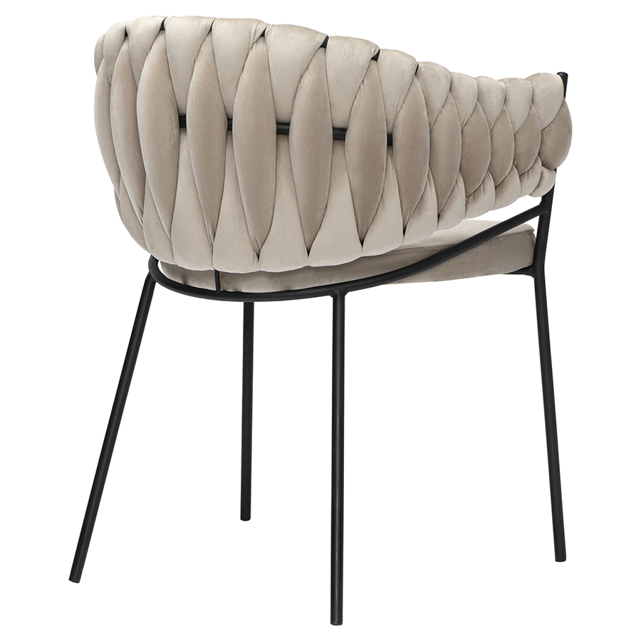 "Кресло Lind поможет сделать акцент на стильном дизайне интерьера. Главная особенность модели – оригинальная плетеная спинка. Бархатистый, приятный на ощупь велюр дарит тактильный комфорт и смягчает строгие формы прочного железного каркаса. За счет высоких ножек модель выглядит утонченно, благодаря чему не перегружает пространство. Сиденье с наполнителем из пенополиуретана, глубокая посадка и наличие подлокотников обеспечивают комфорт во время отдыха. Мебель в спокойных тонах станет оптимальным вариантом для спальни, гостиной, кабинета, оформленных в любой цветовой гамме.