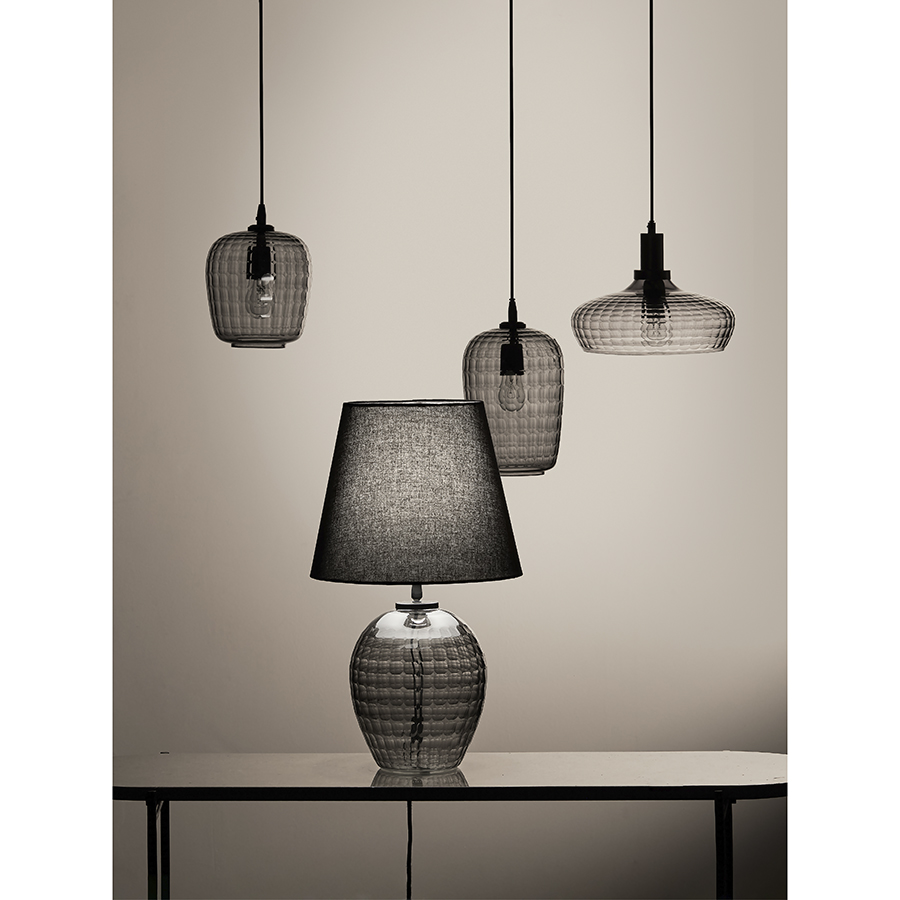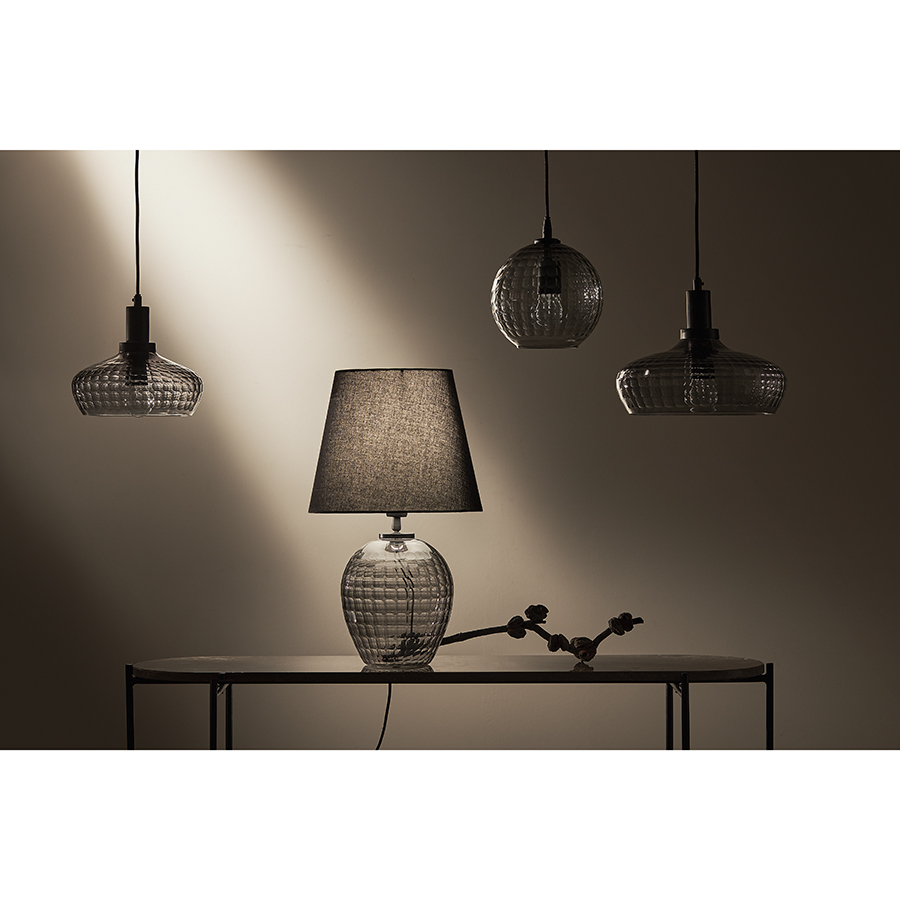 Материалы: стекло, железо, хлопок. Размеры: 19х19х32 см. Длина провода: 1,5 м. Цвет: серый/черный. Тип цоколя: Е27. Максимальная мощность лампы: 40 Вт. Степень пылевлагозащиты: IP20. Площадь освещения: 2,7 кв.м. Лампы в комплекте: нет.
