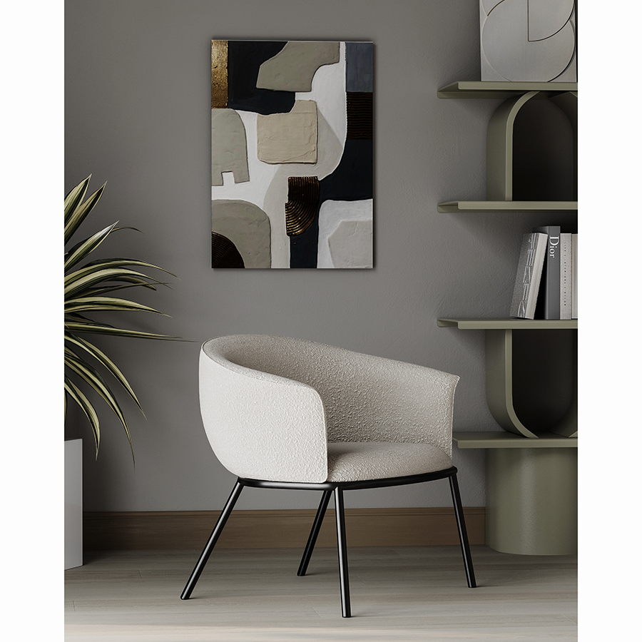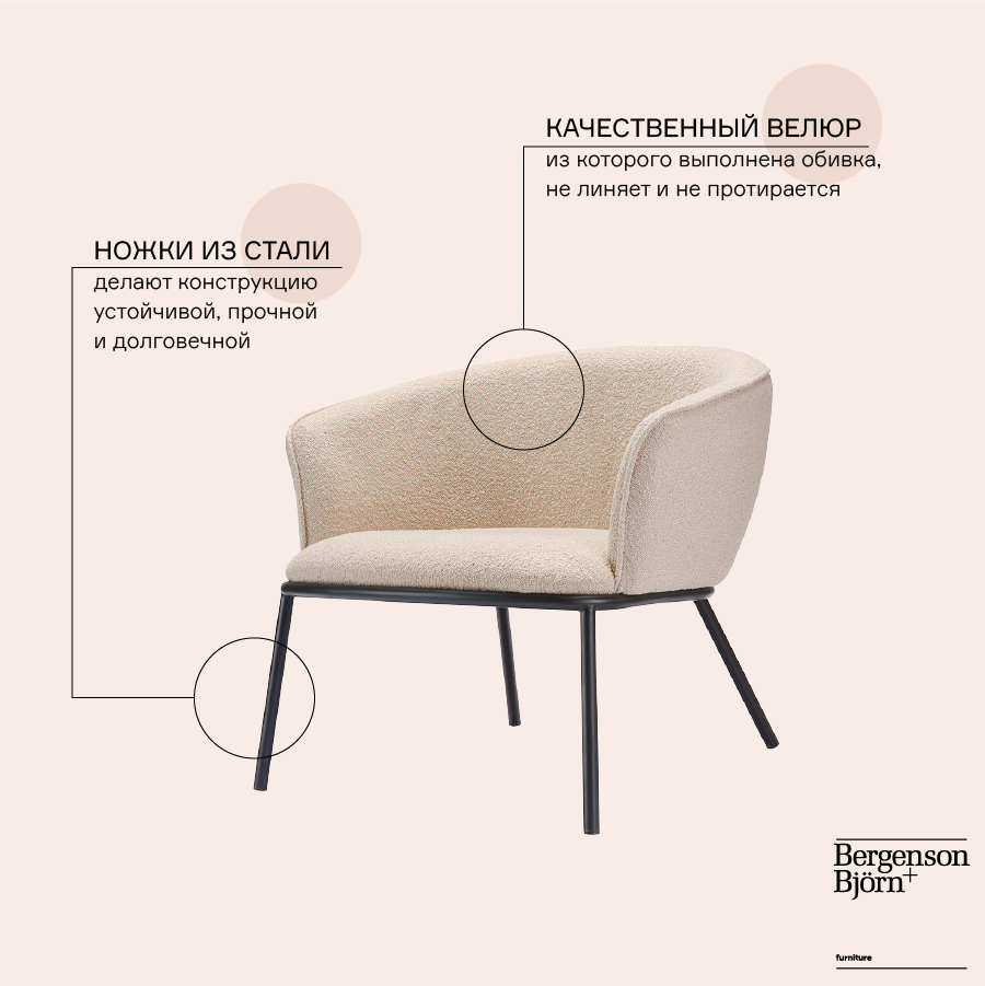 "Лаунж-кресло Paal удачно сочетает в себе элементы современного и классического стилей. Изюминку модели придает сплошная спинка, плавно переходящая в подлокотники, и буклированная обивка. Такой дизайн обеспечивает не только оригинальный вид, а также комфорт при сидении и приятные тактильные ощущения. Светлая мебель с лаконичным силуэтом идеально вписывается в интерьер гостиной, рабочего кабинета или спальни, оформленных в скандинавском стиле, лофт, эклектика, фьюжн, неоклассика и др.