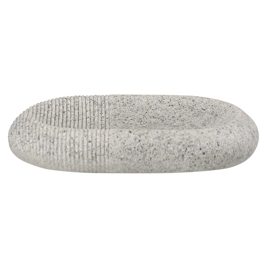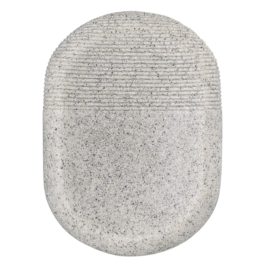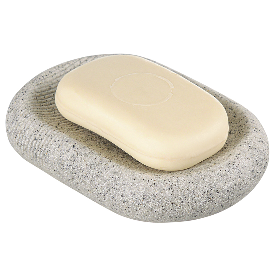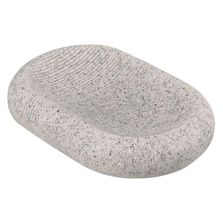 "Мыльница Loup выполнена из полирезина, стилизованного под натуральный камень темно-серого оттенка. Материал легко моется, отличается устойчивостью к влаге, ударам и царапинам, что делает его идеальным выбором для ванной комнаты. Аксессуар компактных размеров занимает минимум места на раковине или полке.
