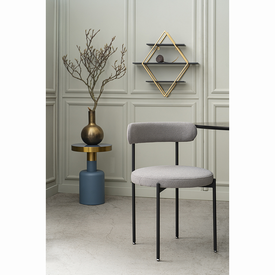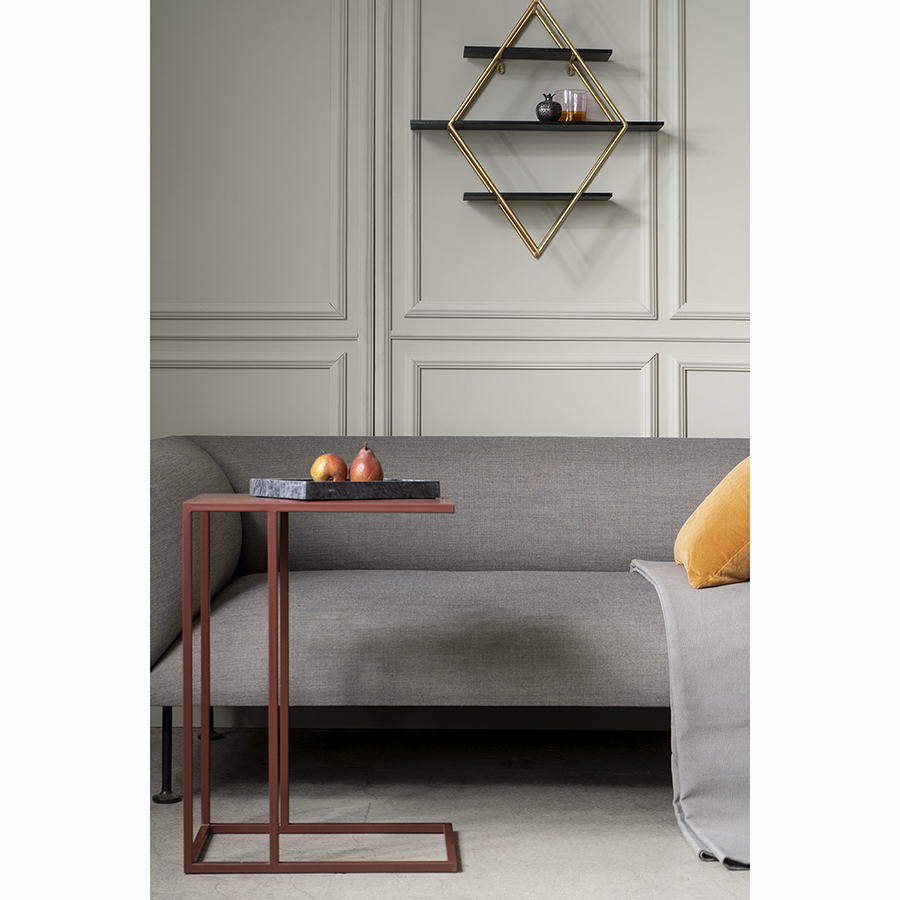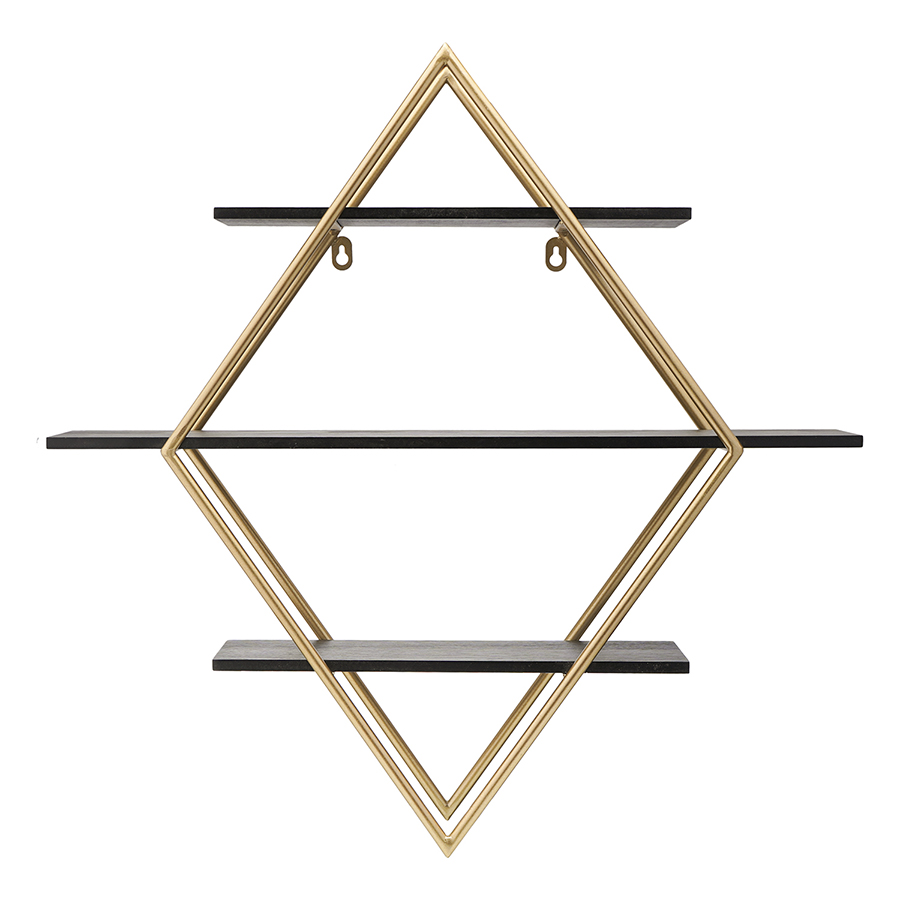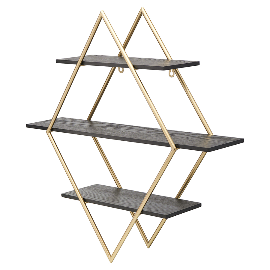 Конструкция имеет железный каркас, что делает ее практичной, надежной и долговечной. Трехъярусная модель дает возможность разместить в одном месте больше предметов. Пространства для хранения выполнены из МДФ – прочного, влагостойкого материала. Необычные геометрические формы обеспечивают в интерьере красивый визуальный эффект, а элементы теплого оттенка латуни добавляют в оформление нотки уюта и благородства.