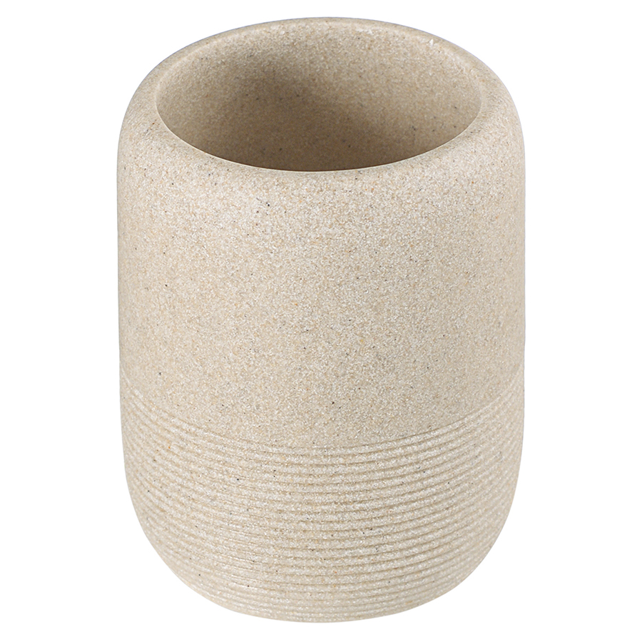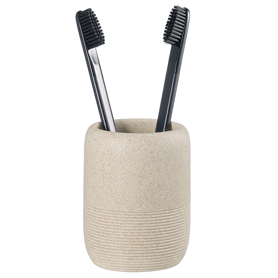 "Стакан для зубных щеток Loup имеет корпус из полирезина, стилизованного под натуральный камень бежевого оттенка. Материал легко моется, отличается устойчивостью к влаге, ударам и царапинам, что делает его идеальным выбором для ванной комнаты. Емкость компактных размеров занимает минимум места на раковине или полке.