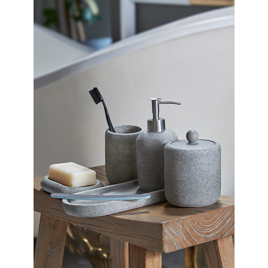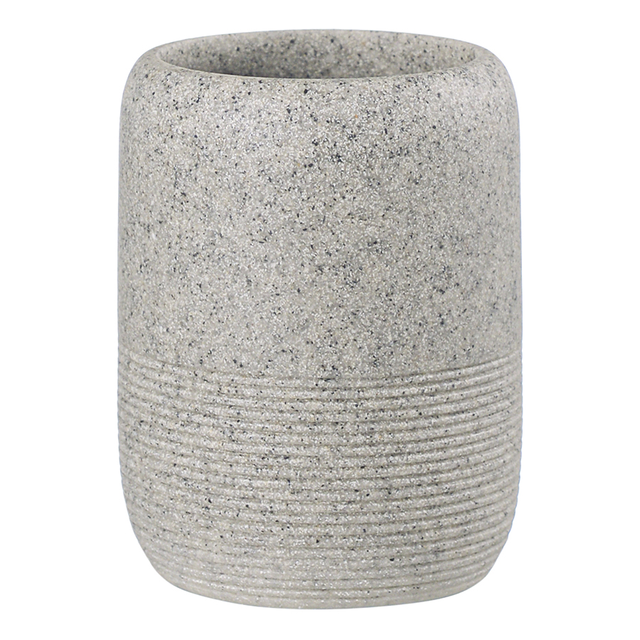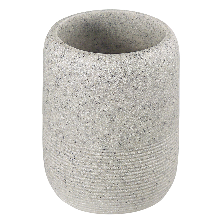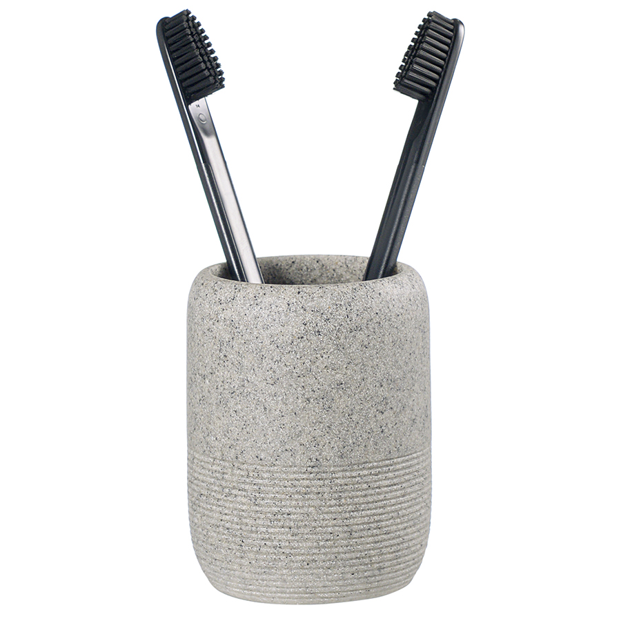 "Стакан для зубных щеток Loup имеет корпус из полирезина, стилизованного под натуральный камень темно-серого оттенка. Материал легко моется, отличается устойчивостью к влаге, ударам и царапинам, что делает его идеальным выбором для ванной комнаты. Емкость компактных размеров занимает минимум места на раковине или полке.