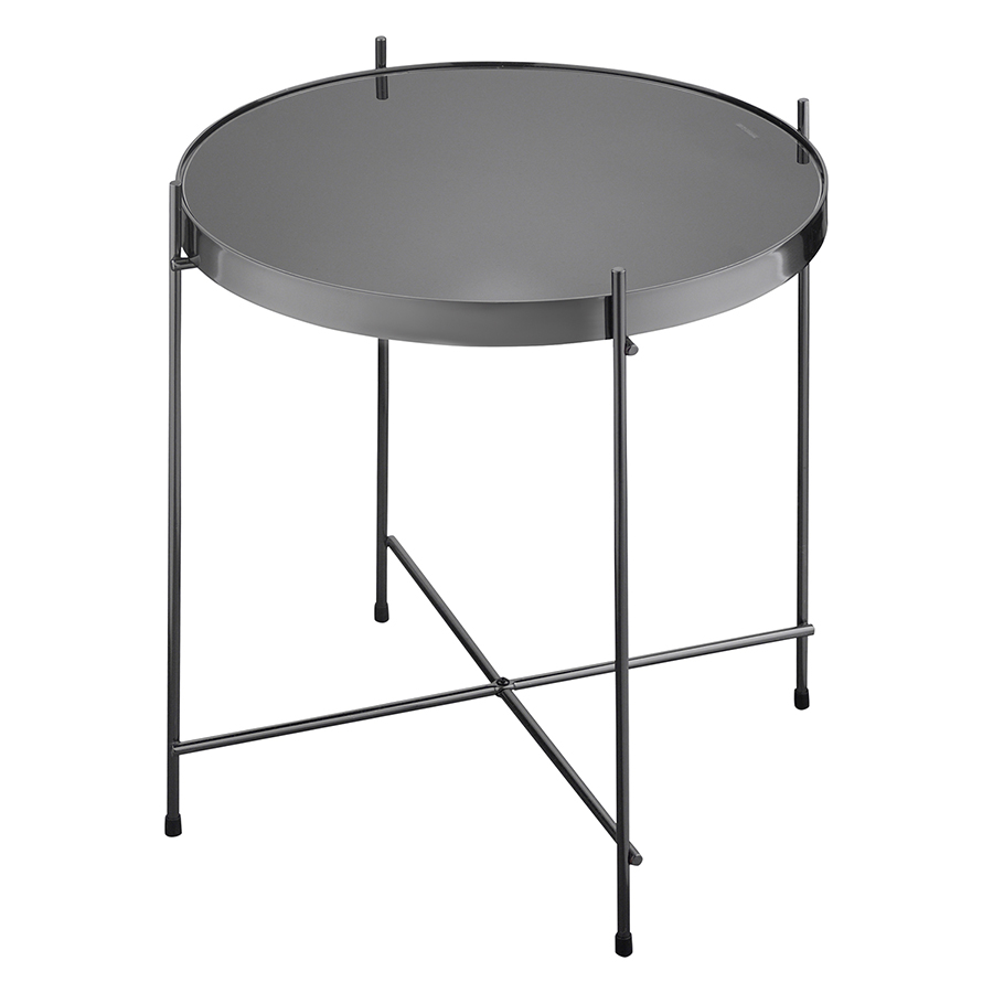 Материалы: столешница – черное закаленное стекло, каркас – сталь. Размеры: диаметр – 42,7 см, высота – 43 см.