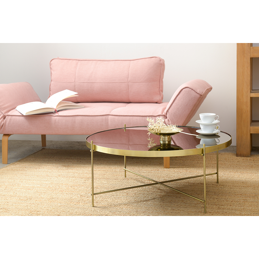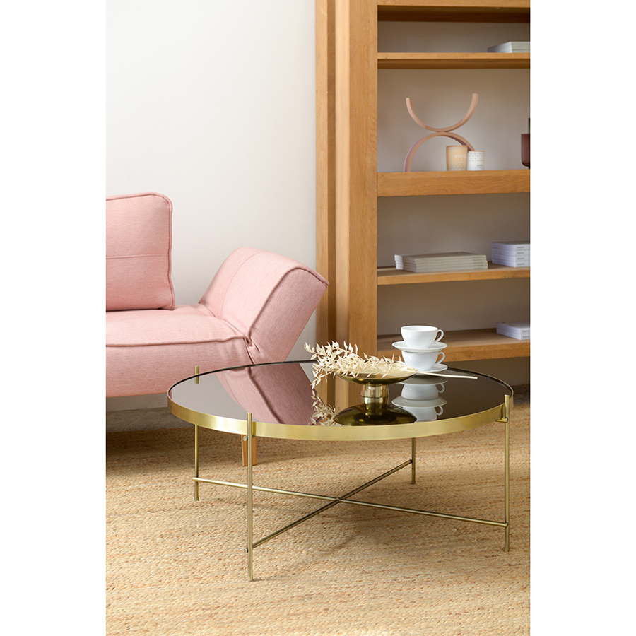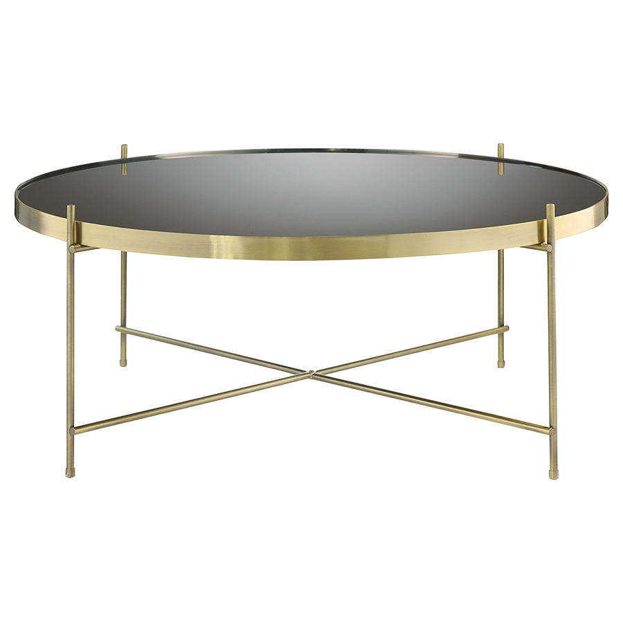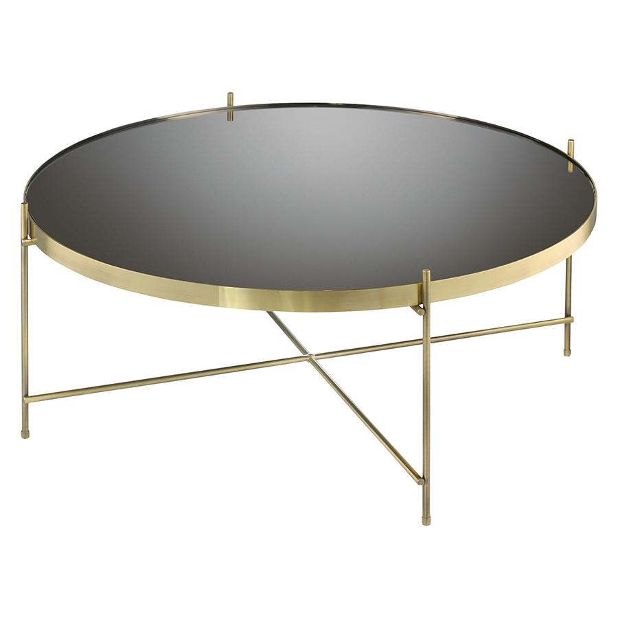 Материалы: столешница – коричневое зеркало, каркас – сталь с латунным напылением. Размеры: диаметр – 84,8 см, высота – 33 см.