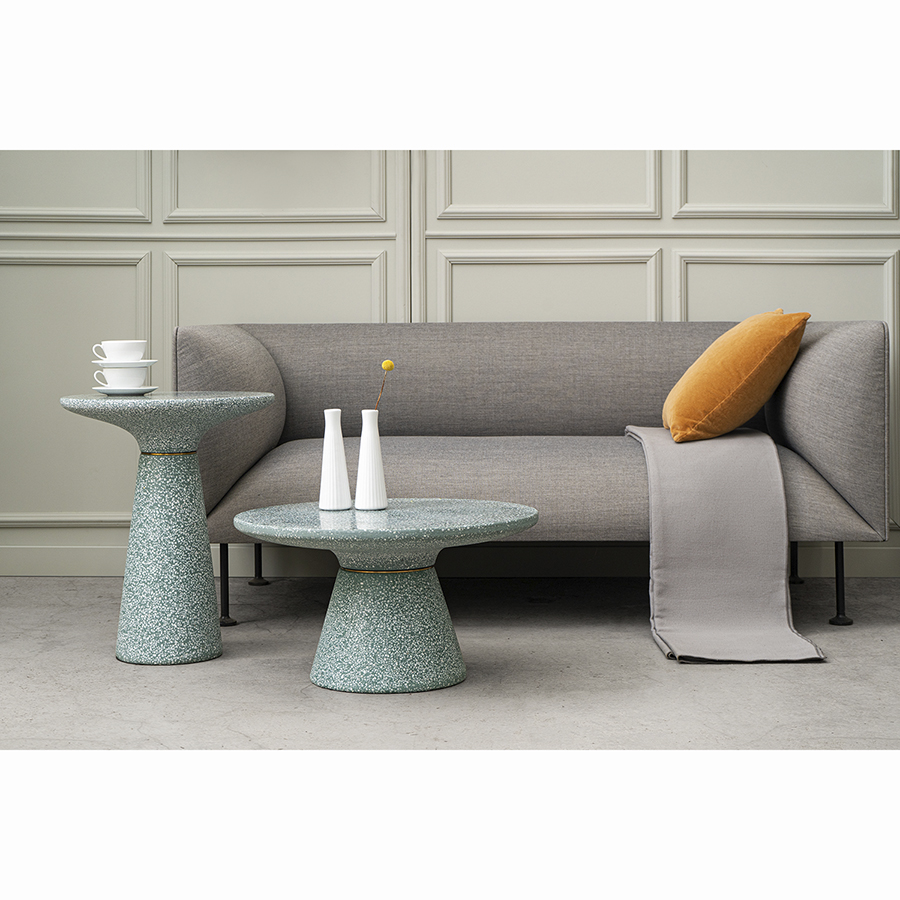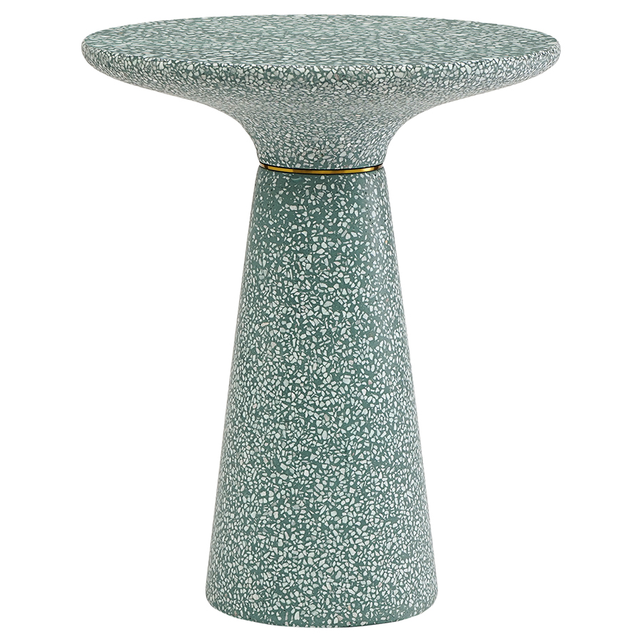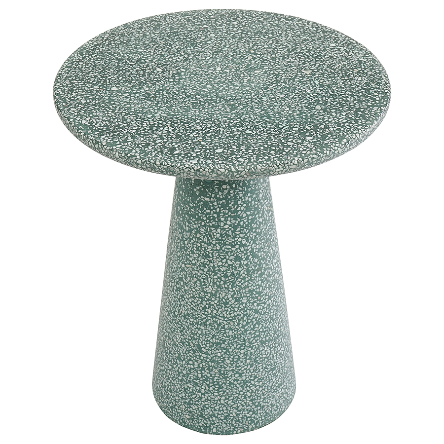 Столешница и основание столика выполнены из материала терраццо, характеризующегося высокой прочностью и устойчивостью к износу. В его состав входят мелкие кусочки натурального камня, скрепленные цементным раствором с добавлением пластификаторов. Поверхность терраццо гладкая, приятная на ощупь, прекрасно смотрится и не требует сложного ухода. Столешница диаметром 45 см позволяет размещать все необходимое – чашки кофе, десерты и прочее. При этом модель имеет компактные размеры, что способствует экономии полезного пространства.