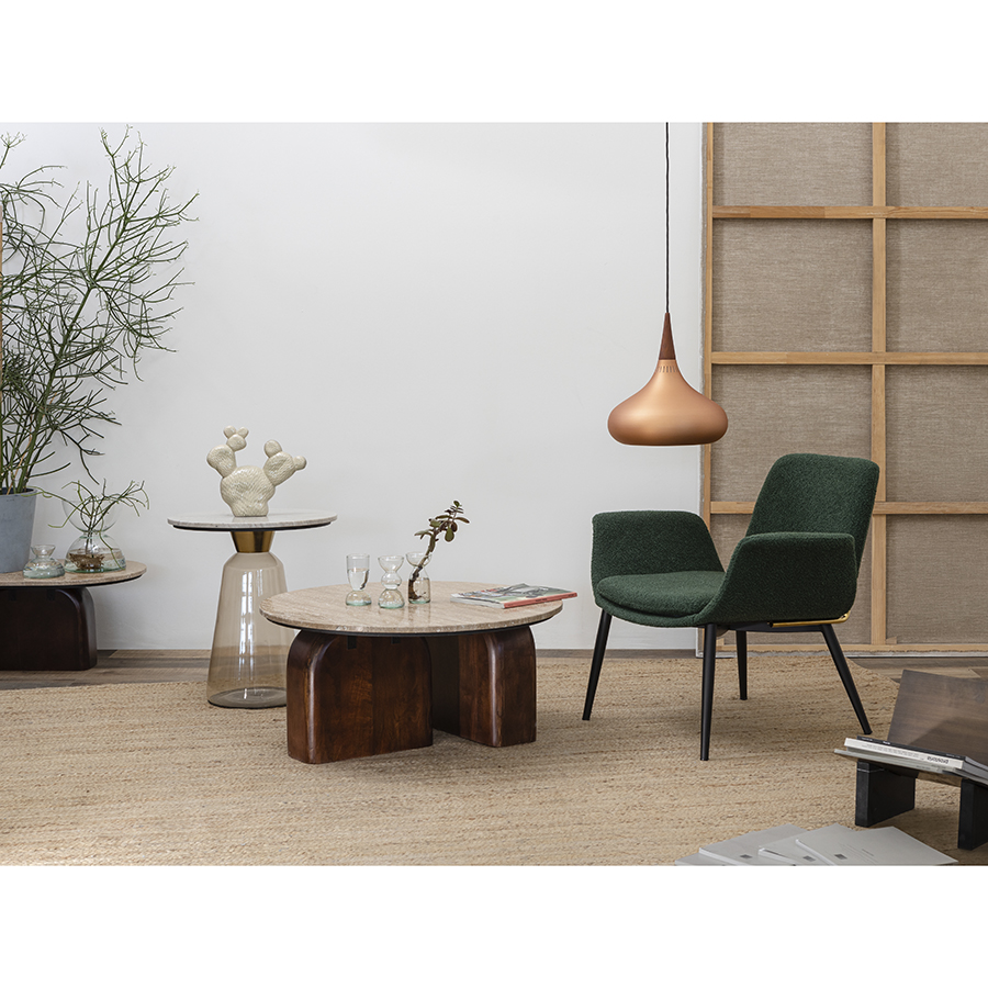 "Кофейный столик Odd обращает на себя внимание благодаря необычному дизайну. Изюминкой модели является прозрачное основание из ударопрочного стекла. Эффектная столешница с мраморным узором придает силуэту нотки изысканности и благородства. Мебель идеально подходит для обустройства интерьера в стиле неоклассика, минимализм, хай-тек и др.