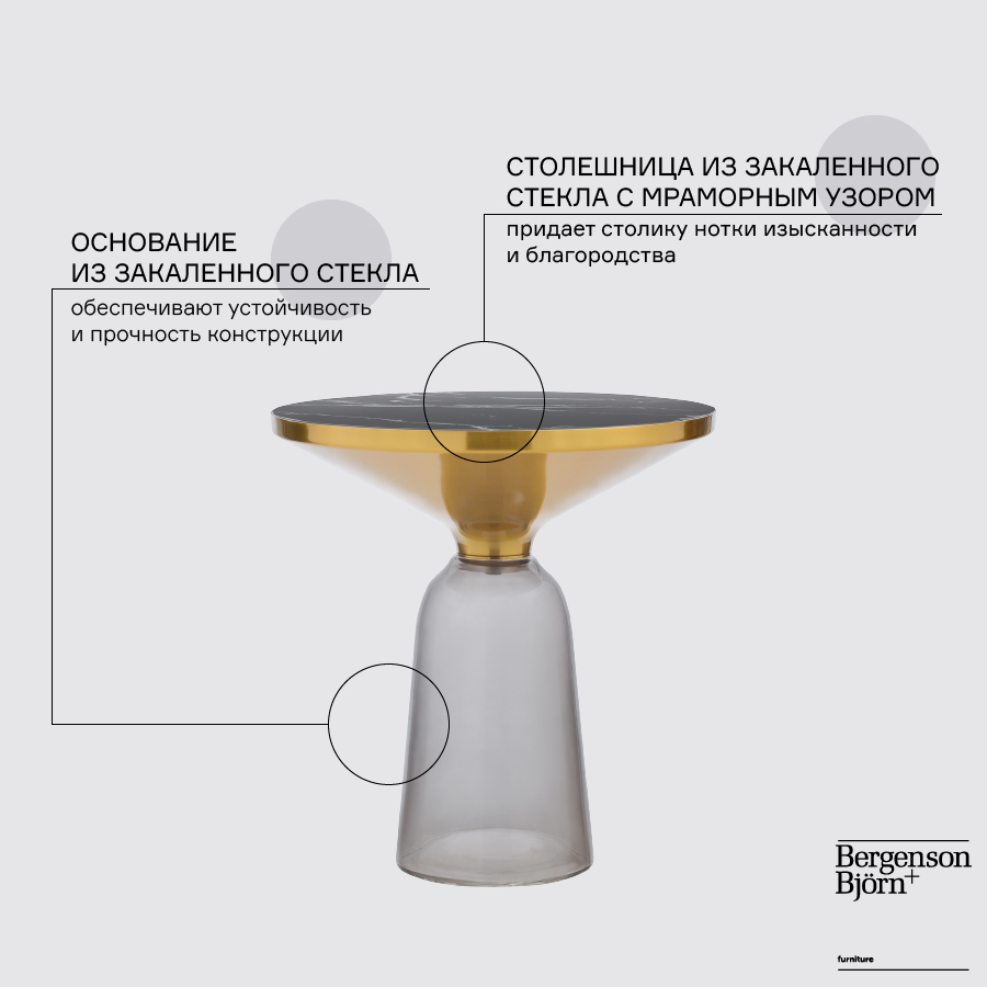 "Кофейный столик Odd обращает на себя внимание благодаря необычному дизайну. Изюминкой модели является прозрачное основание из закаленного стекла. Эффектная столешница с мраморным узором придает силуэту нотки изысканности и благородства. Мебель идеально подходит для обустройства интерьера в стиле неоклассика, минимализм, хай-тек и др.