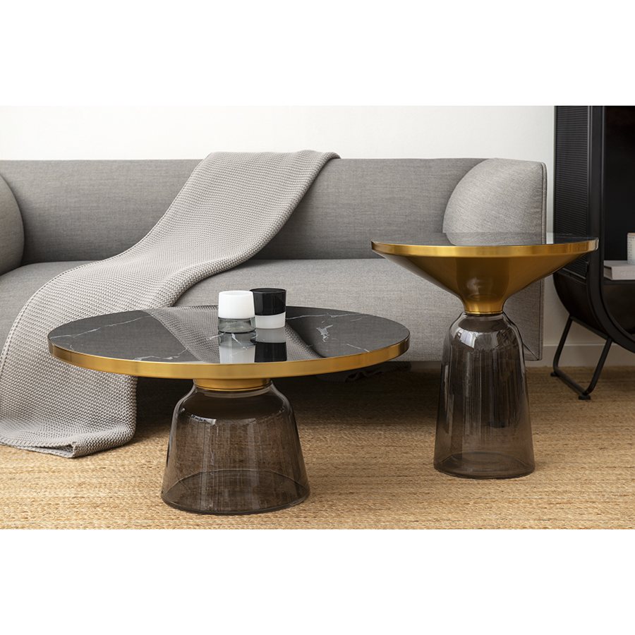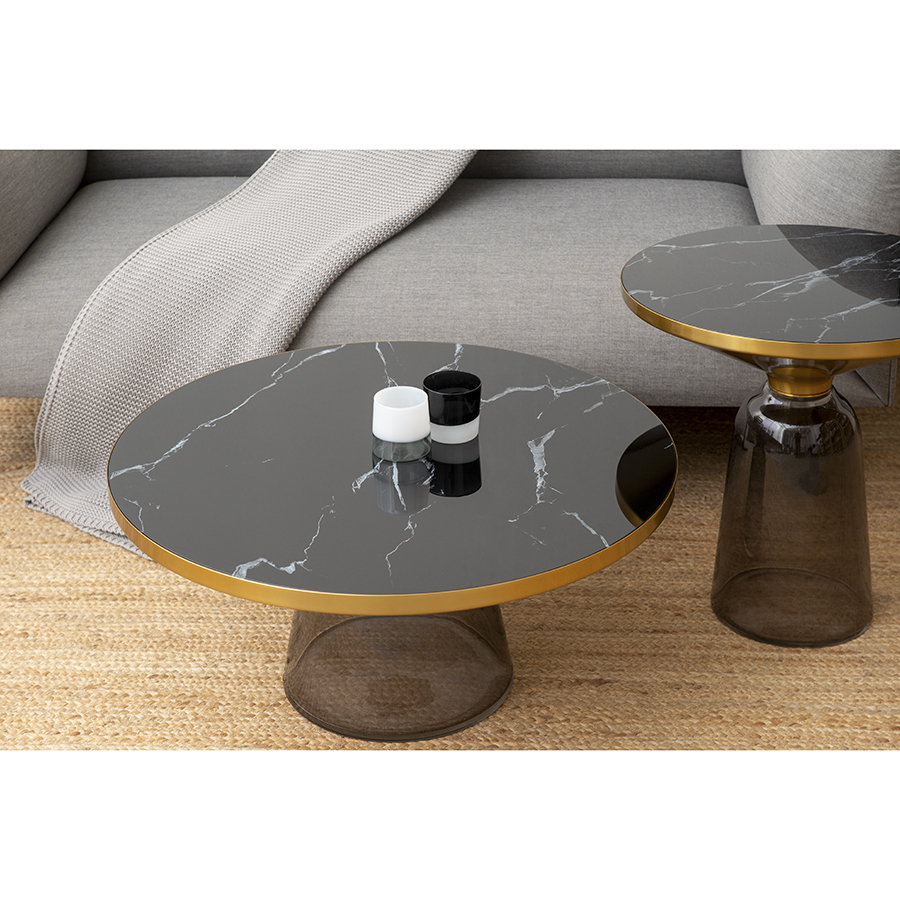 "Кофейный столик Odd обращает на себя внимание благодаря необычному дизайну. Изюминкой модели является прозрачное основание из закаленного стекла. Эффектная столешница с мраморным узором придает силуэту нотки изысканности и благородства. Мебель идеально подходит для обустройства интерьера в стиле неоклассика, минимализм, хай-тек и др.
