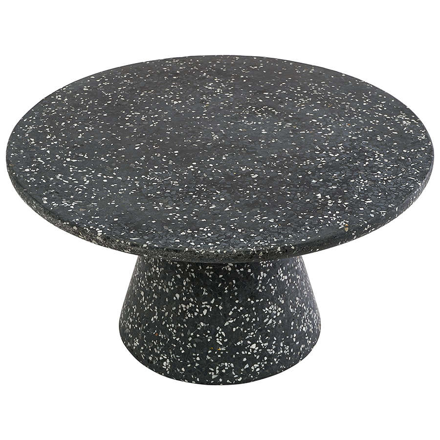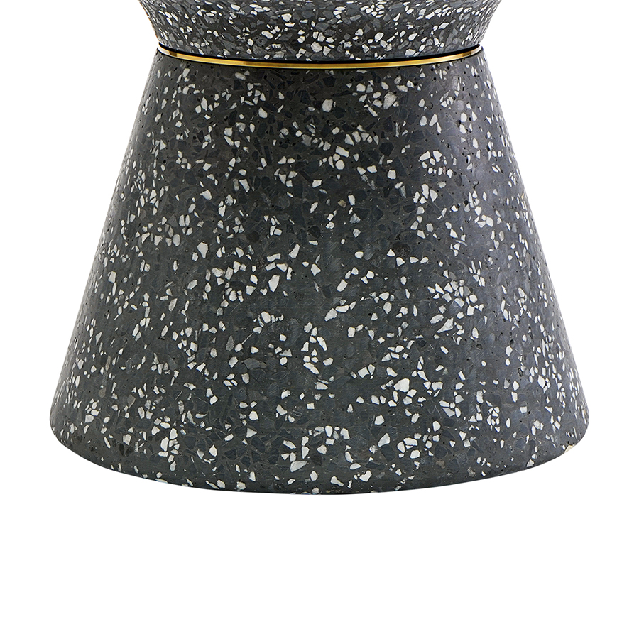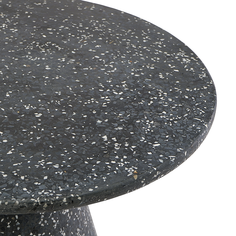 Столешница и основание столика выполнены из материала терраццо, характеризующегося высокой прочностью и устойчивостью к износу. В его состав входят мелкие кусочки натурального камня, скрепленные цементным раствором с добавлением пластификаторов. Поверхность терраццо гладкая, приятная на ощупь, прекрасно смотрится и не требует сложного ухода. Столешница диаметром 60 см позволяет размещать все необходимое – от чашек кофе до любимых книг и декора. При этом модель имеет компактные размеры, что способствует экономии полезного пространства.