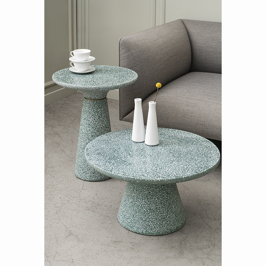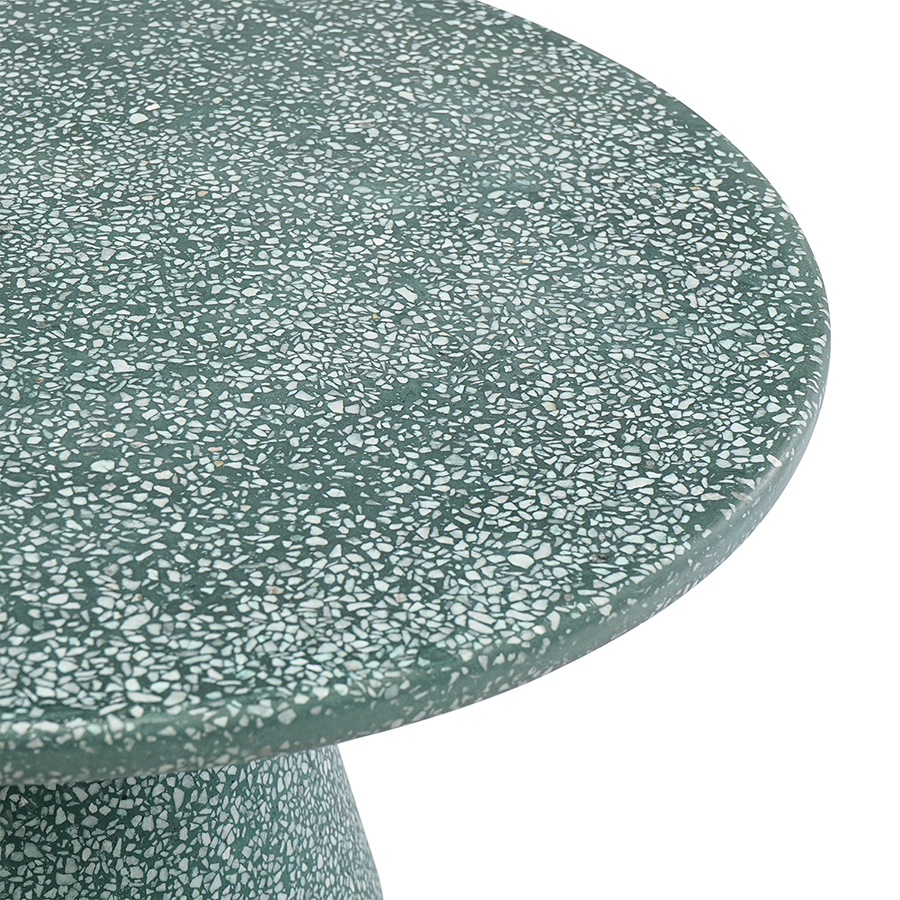 Столешница и основание столика выполнены из материала терраццо, характеризующегося высокой прочностью и устойчивостью к износу. В его состав входят мелкие кусочки натурального камня, скрепленные цементным раствором с добавлением пластификаторов. Поверхность терраццо гладкая, приятная на ощупь, прекрасно смотрится и не требует сложного ухода. Столешница диаметром 60 см позволяет размещать все необходимое – от чашек кофе до любимых книг и декора. При этом модель имеет компактные размеры, что способствует экономии полезного пространства.