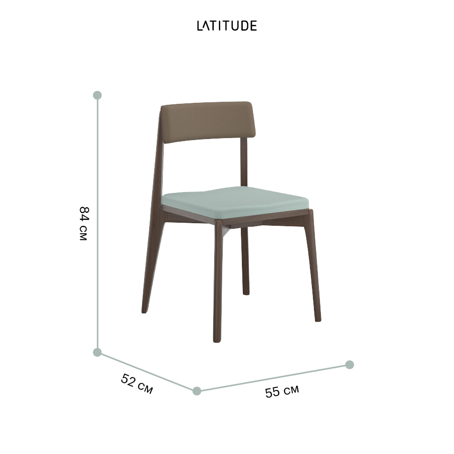 Материалы: массив ясеня, фанера, 100%, полиуретан, 100%, полиэстер. Размеры: 52х55х84 см. Высота сиденья: 48 см. Ширина сиденья: 45 см. Глубина сиденья: 44 см. Высота спинки: 37 см. Ширина спинки: 40 см. Максимальная нагрузка: 136 кг. Цвет основания: орех. Цвет обивки: темно-коричневый/мятный.