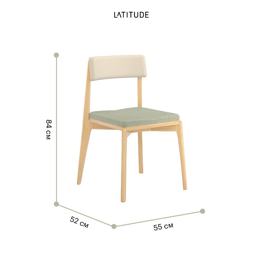Материалы: массив ясеня, фанера, 100%, полиуретан, 100%, полиэстер. Размеры: 52х55х84 см. Высота сиденья: 48 см. Ширина сиденья: 45 см. Глубина сиденья: 44 см. Высота спинки: 37 см. Ширина спинки: 40 см. Максимальная нагрузка: 136 кг. Цвет основания: ясень. Цвет обивки: бежевый/зеленый.