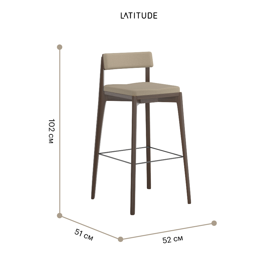 Материалы: массив ясеня, фанера, 100%, полиуретан, 100%, полиэстер, сталь. Размеры: 51х52х102 см. Высота сиденья: 79 см. Ширина сиденья: 39 см. Глубина сиденья: 37 см. Высота спинки: 24 см. Ширина спинки: 37 см. Высота подножки: 33 см. Максимальная нагрузка: 136 кг. Цвет основания: орех. Цвет обивки: бежевый.