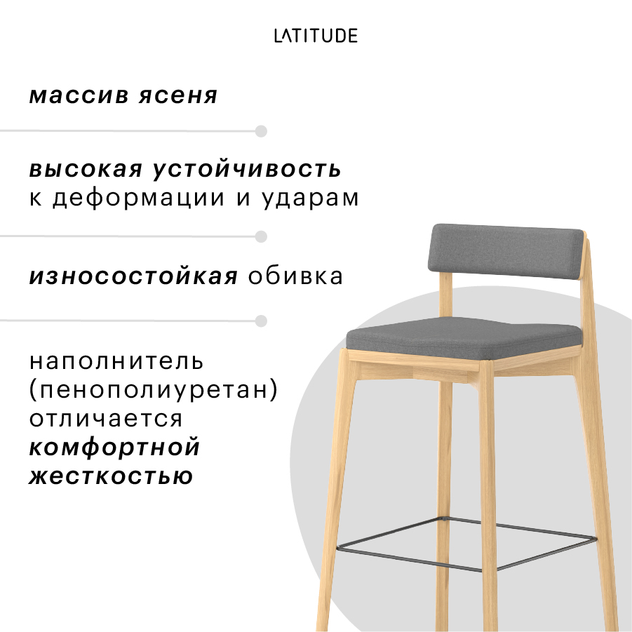 Материалы: массив ясеня, фанера, 100%, полиуретан, 100%, полиэстер, сталь. Размеры: 51х52х102 см. Высота сиденья: 79 см. Ширина сиденья: 39 см. Глубина сиденья: 37 см. Высота спинки: 24 см. Ширина спинки: 37 см. Высота подножки: 33 см. Максимальная нагрузка: 136 кг. Цвет основания: ясень. Цвет обивки: серый.