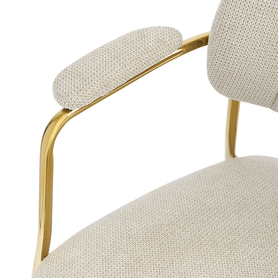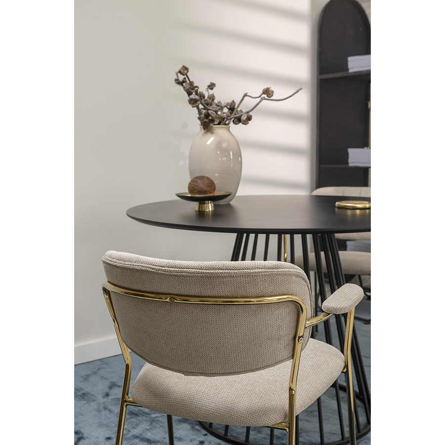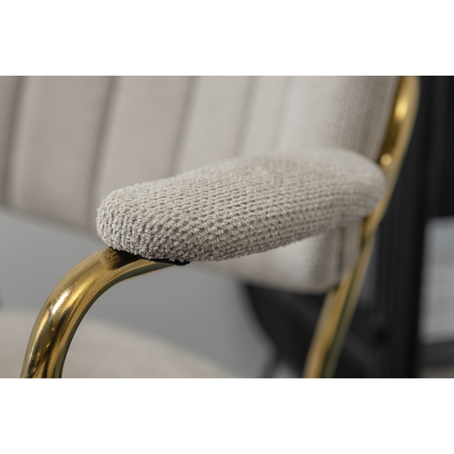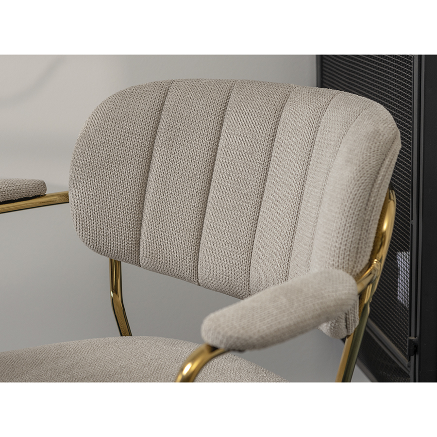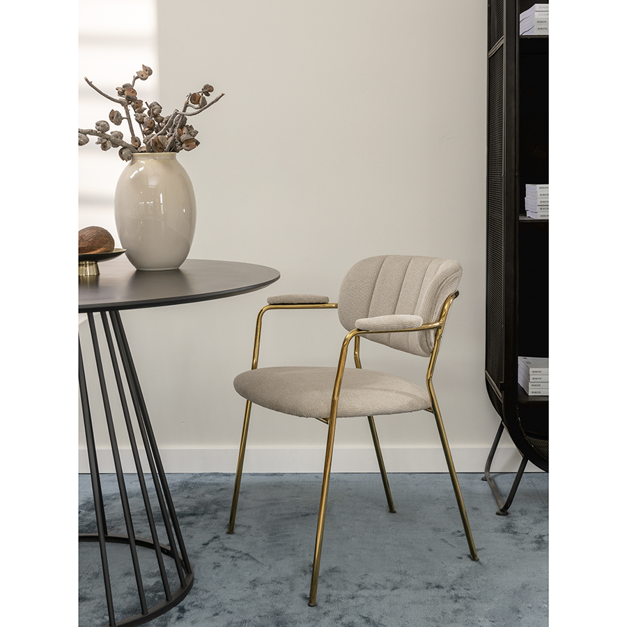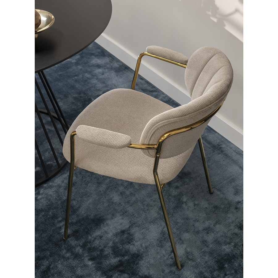 "Стул Eirill с обивкой из фактурного шенилла смотрится стильно и презентабельно. Материал приятный на ощупь, износостойкий и нетребовательный в уходе. Комфорт при сидении достигается за счет широкой, полукруглой спинки, глубокой посадки и высоких подлокотников с мягкими накладками. Плавные формы и декоративная строчка делают дизайн элегантным. Практичность и долговечность мебели обеспечивает прочный и надежный железный каркас. Модель органично вписывается в интерьер, оформленный в скандинавском стиле, эклектика, фьюжн, неоклассика и др.