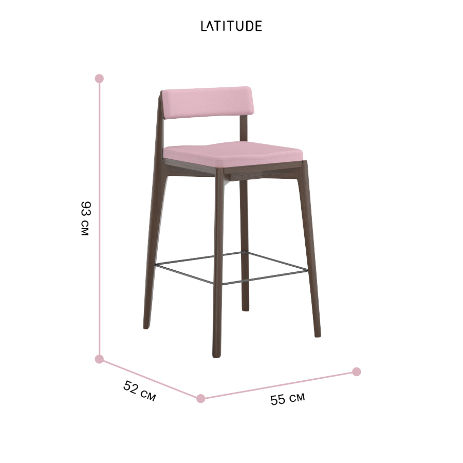Материалы: массив ясеня, фанера, 100%, полиуретан, 100%, полиэстер, сталь. Размеры: 52х55х93 см. Высота сиденья: 69 см. Ширина сиденья: 39 см. Глубина сиденья: 37 см. Высота спинки: 23 см. Ширина спинки: 37 см. Высота подножки: 25 см. Максимальная нагрузка: 136 кг. Цвет основания: орех. Цвет обивки: розовый.