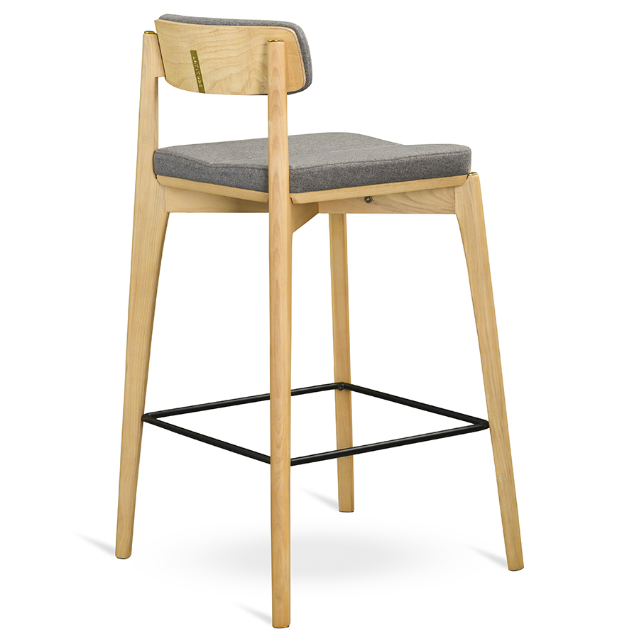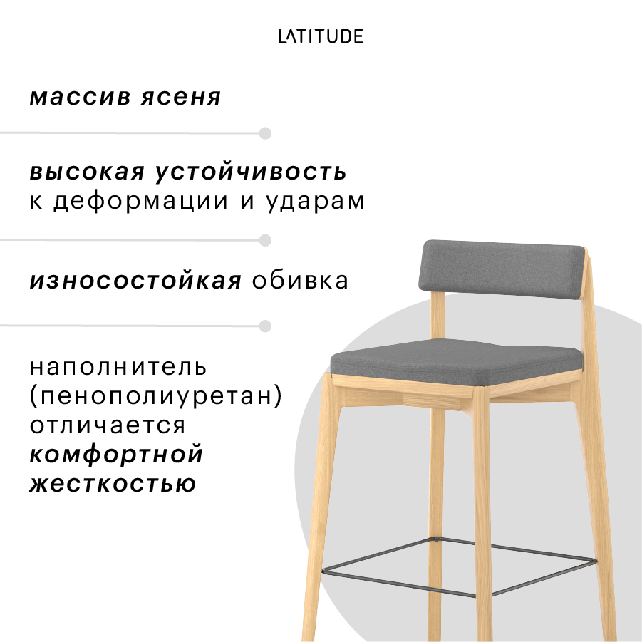 Материалы: массив ясеня, фанера, 100%, полиуретан, 100%, полиэстер, сталь. Размеры: 52х55х93 см. Высота сиденья: 69 см. Ширина сиденья: 39 см. Глубина сиденья: 37 см. Высота спинки: 23 см. Ширина спинки: 37 см. Высота подножки: 25 см. Максимальная нагрузка: 136 кг. Цвет основания: ясень. Цвет обивки: серый.