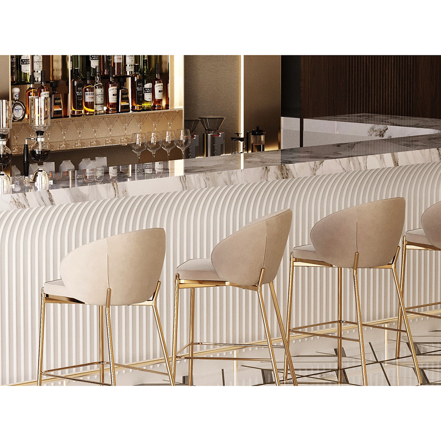 Комфорт во время отдыха на полубарном стуле создается за счет мягкого сиденья с наполнителем из пенополиуретана и высокой закругленной спинки. Обивка из бархатистого велюра, украшенная декоративной строчкой, придает модели особый шарм. Эстетический потенциал материала настолько высок, что ему сложно найти конкурентов. Помимо презентабельного вида и приятных тактильных ощущений, ткань обладает хорошими эксплуатационными характеристиками, такими как прочность, износоустойчивость и долговечность. Ножки мебели выполнены из железа с гальваническим покрытием, что обеспечивает конструкции надежность.
