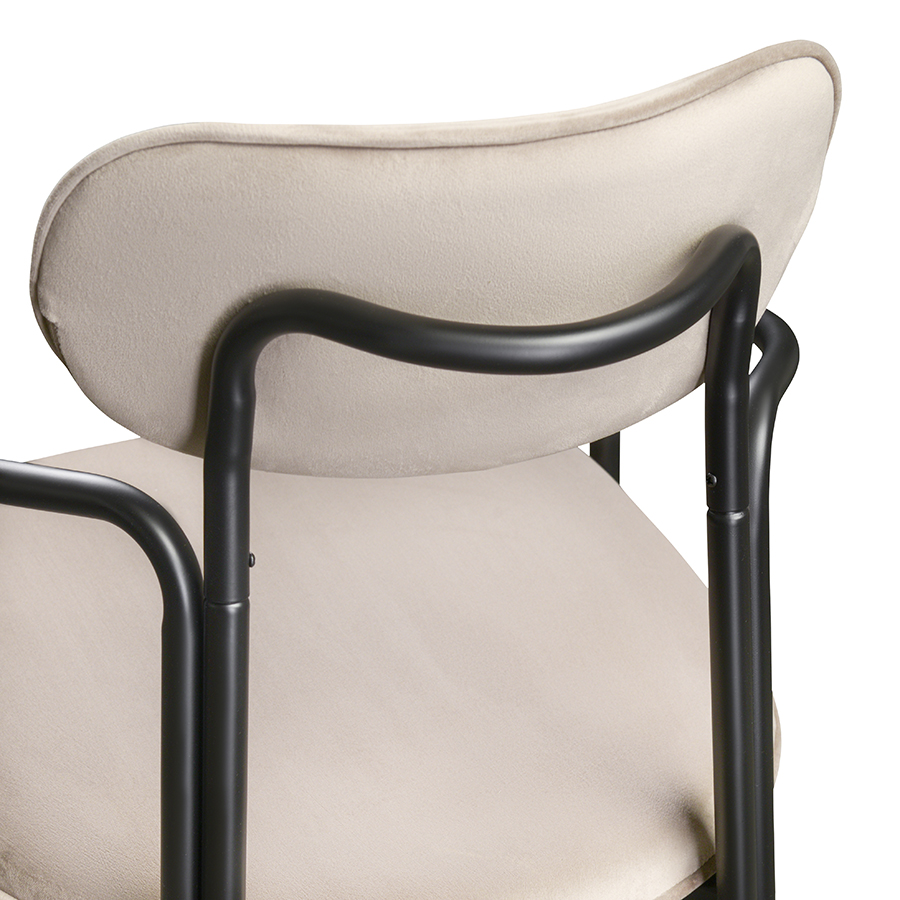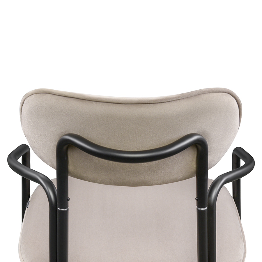 Стальное основание с порошковым покрытием делает конструкцию прочной и надежной, а мягкий велюр с бархатистой текстурой обеспечивает тактильный комфорт. Ткань обивки обладает высокими показателями износостойкости. Используемый пенополиуретан отличается комфортной плотностью и жесткостью.