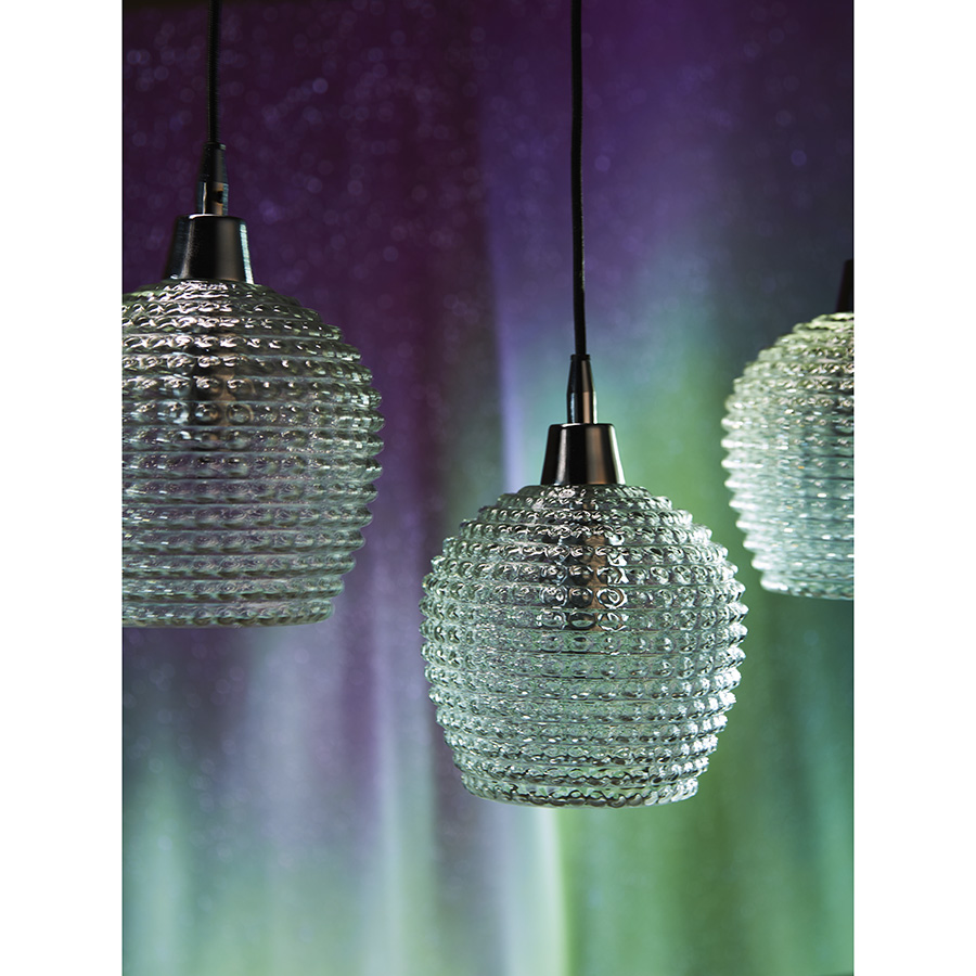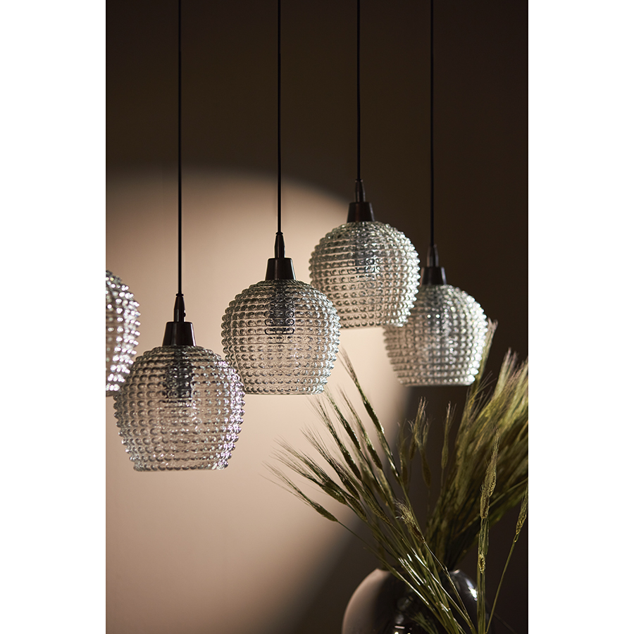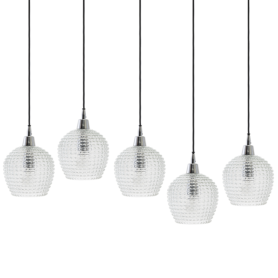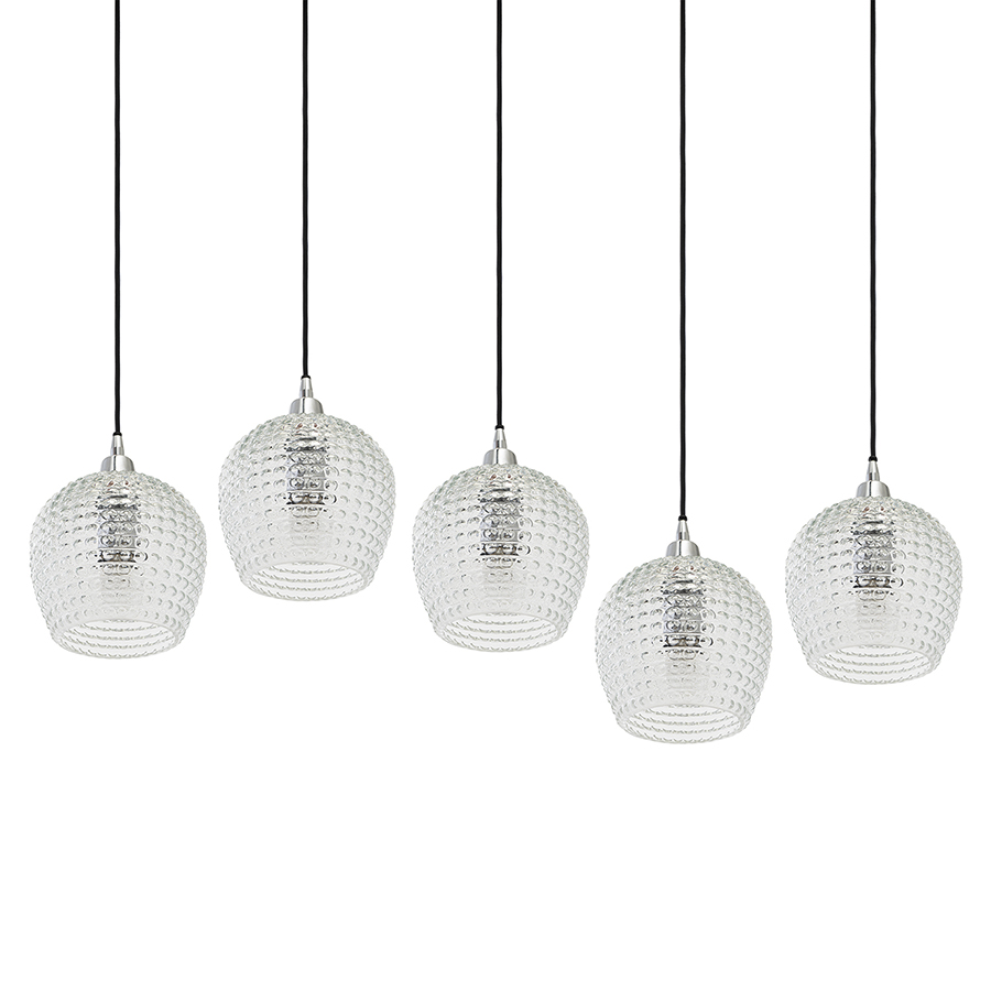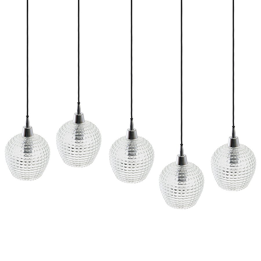 Материалы: стекло, железо. Размеры: 110х18х150 см. Цвет: прозрачный. Длина провода: 1,1 м, 1,3 м, 1,5 м. Тип цоколя: 5хЕ27. Максимальная мощность ламп: 5х25 Вт. Степень пылевлагозащиты: IP20. Площадь освещения: 8,5 кв.м. Лампы в комплекте: нет.
