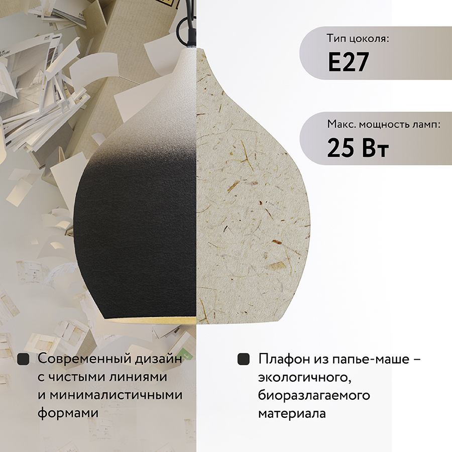 - Плафон из папье-маше – экологичного, биоразлагаемого материала делает подвес визуально более легким, изящным и оригинальным.